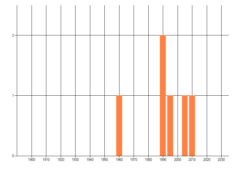 Het aantal atlasblokken (5x5 km) waarin de soort is gemeld binnen een periode van vijf jaar (vanaf 1980) of twintig jaar. Niet gecorrigeerd voor waarnemersinspanning en het aantal doorgegeven waarnemingen kan sterk variëren per periode, dus een trend in verspreiding kan hier niet direct uit worden afgelezen. Het opgegeven jaartal is het eerste jaar van de periode. Bron: gevalideerde waarnemingen uit de NDFF.
