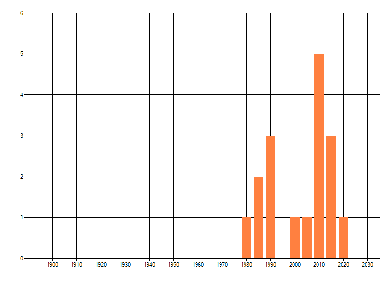 Het aantal atlasblokken (5x5 km) waarin de soort is gemeld binnen een periode van vijf jaar (vanaf 1980) of twintig jaar. Niet gecorrigeerd voor waarnemersinspanning en het aantal doorgegeven waarnemingen kan sterk variëren per periode, dus een trend in verspreiding kan hier niet direct uit worden afgelezen. Het opgegeven jaartal is het eerste jaar van de periode. Bron: gevalideerde waarnemingen uit de NDFF.