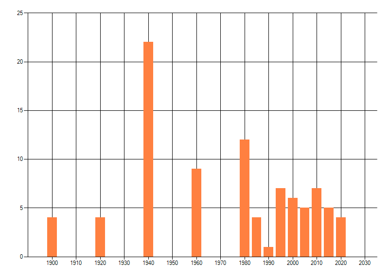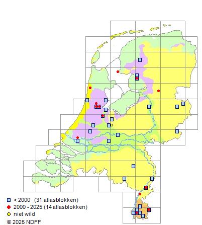 Het aantal atlasblokken (5x5 km) waarin de soort is gemeld binnen een periode van vijf jaar (vanaf 1980) of twintig jaar. Niet gecorrigeerd voor waarnemersinspanning en het aantal doorgegeven waarnemingen kan sterk variëren per periode, dus een trend in verspreiding kan hier niet direct uit worden afgelezen. Het opgegeven jaartal is het eerste jaar van de periode. Bron: gevalideerde waarnemingen uit de NDFF.