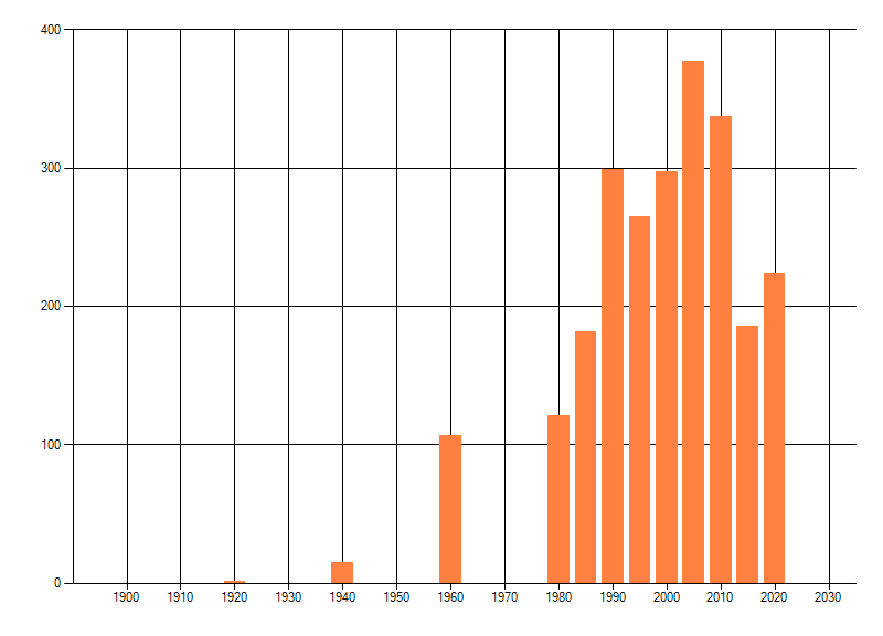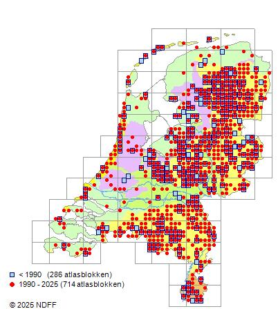 Het aantal atlasblokken (5x5 km) waarin de soort is gemeld binnen een periode van vijf jaar (vanaf 1980) of twintig jaar. Niet gecorrigeerd voor waarnemersinspanning en het aantal doorgegeven waarnemingen kan sterk variëren per periode, dus een trend in verspreiding kan hier niet direct uit worden afgelezen. Het opgegeven jaartal is het eerste jaar van de periode. Bron: gevalideerde waarnemingen uit de NDFF.