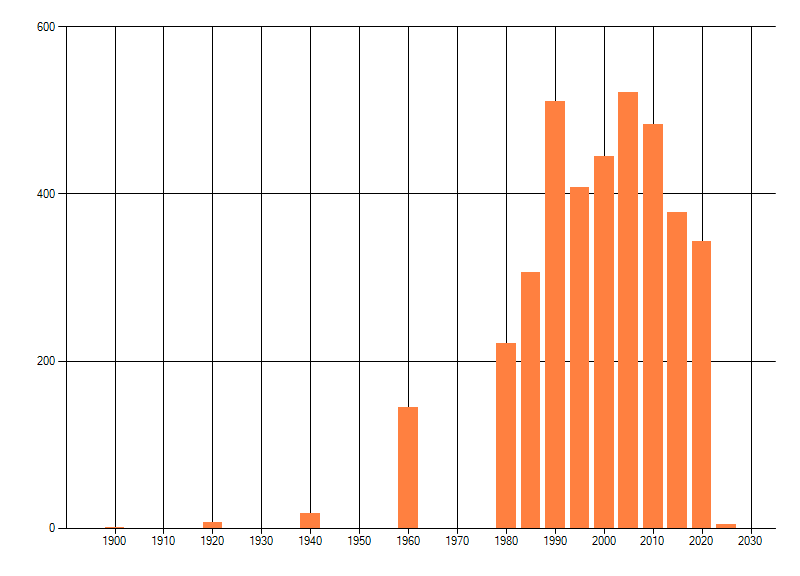 Het aantal atlasblokken (5x5 km) waarin de soort is gemeld binnen een periode van vijf jaar (vanaf 1980) of twintig jaar. Niet gecorrigeerd voor waarnemersinspanning en het aantal doorgegeven waarnemingen kan sterk variëren per periode, dus een trend in verspreiding kan hier niet direct uit worden afgelezen. Het opgegeven jaartal is het eerste jaar van de periode. Bron: gevalideerde waarnemingen uit de NDFF.