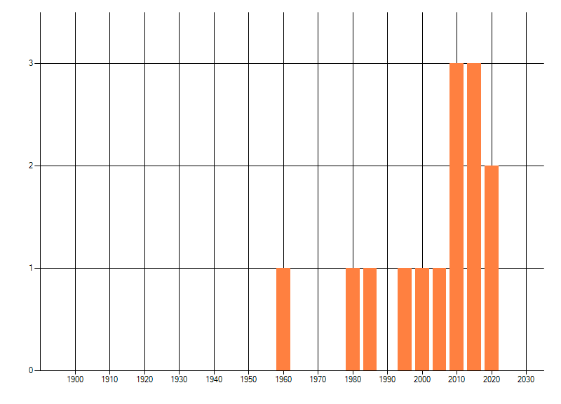 Het aantal atlasblokken (5x5 km) waarin de soort is gemeld binnen een periode van vijf jaar (vanaf 1980) of twintig jaar. Niet gecorrigeerd voor waarnemersinspanning en het aantal doorgegeven waarnemingen kan sterk variëren per periode, dus een trend in verspreiding kan hier niet direct uit worden afgelezen. Het opgegeven jaartal is het eerste jaar van de periode. Bron: gevalideerde waarnemingen uit de NDFF.