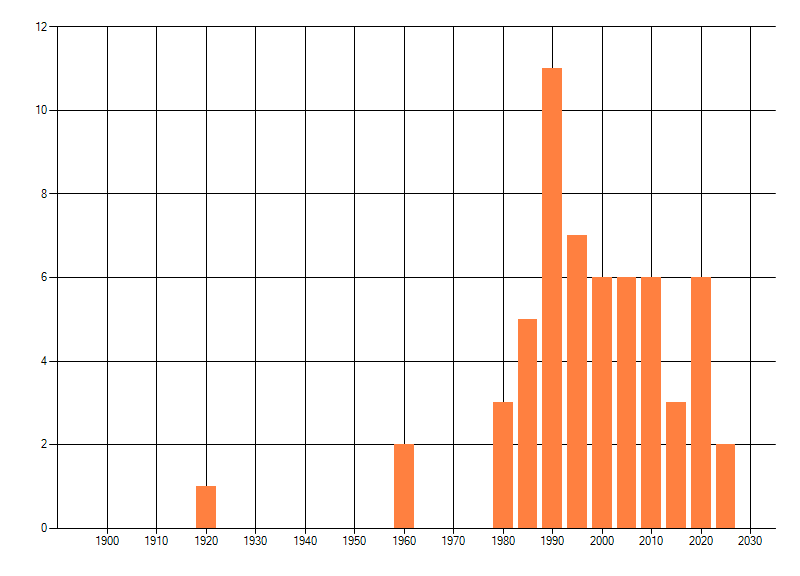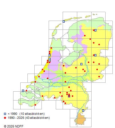Het aantal atlasblokken (5x5 km) waarin de soort is gemeld binnen een periode van vijf jaar (vanaf 1980) of twintig jaar. Niet gecorrigeerd voor waarnemersinspanning en het aantal doorgegeven waarnemingen kan sterk variëren per periode, dus een trend in verspreiding kan hier niet direct uit worden afgelezen. Het opgegeven jaartal is het eerste jaar van de periode. Bron: gevalideerde waarnemingen uit de NDFF.