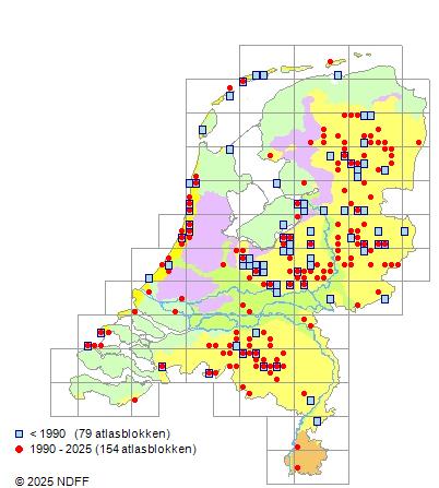 Het aantal atlasblokken (5x5 km) waarin de soort is gemeld binnen een periode van vijf jaar (vanaf 1980) of twintig jaar. Niet gecorrigeerd voor waarnemersinspanning en het aantal doorgegeven waarnemingen kan sterk variëren per periode, dus een trend in verspreiding kan hier niet direct uit worden afgelezen. Het opgegeven jaartal is het eerste jaar van de periode. Bron: gevalideerde waarnemingen uit de NDFF.