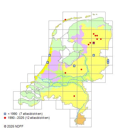 Het aantal atlasblokken (5x5 km) waarin de soort is gemeld binnen een periode van vijf jaar (vanaf 1980) of twintig jaar. Niet gecorrigeerd voor waarnemersinspanning en het aantal doorgegeven waarnemingen kan sterk variëren per periode, dus een trend in verspreiding kan hier niet direct uit worden afgelezen. Het opgegeven jaartal is het eerste jaar van de periode. Bron: gevalideerde waarnemingen uit de NDFF.