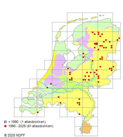 Het aantal atlasblokken (5x5 km) waarin de soort is gemeld binnen een periode van vijf jaar (vanaf 1980) of twintig jaar. Niet gecorrigeerd voor waarnemersinspanning en het aantal doorgegeven waarnemingen kan sterk variëren per periode, dus een trend in verspreiding kan hier niet direct uit worden afgelezen. Het opgegeven jaartal is het eerste jaar van de periode. Bron: gevalideerde waarnemingen uit de NDFF.