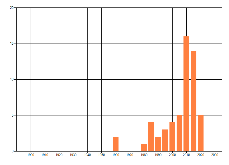 Het aantal atlasblokken (5x5 km) waarin de soort is gemeld binnen een periode van vijf jaar (vanaf 1980) of twintig jaar. Niet gecorrigeerd voor waarnemersinspanning en het aantal doorgegeven waarnemingen kan sterk variëren per periode, dus een trend in verspreiding kan hier niet direct uit worden afgelezen. Het opgegeven jaartal is het eerste jaar van de periode. Bron: gevalideerde waarnemingen uit de NDFF.