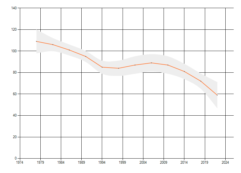 Gemiddelde trend van het aantal kilometerhokken waarin de soort voorkomt, weergegeven als indexcijfer (1975-1978 = 100). De trend is gecorrigeerd voor waarnemersinspanning en geeft de relatieve verandering in het aantal bezette kilometerhokken weer. Voor de berekening worden de data per periode van vier jaar samengenomen. In de grafiek correspondeert ieder punt met het laatste jaar van zo'n periode.