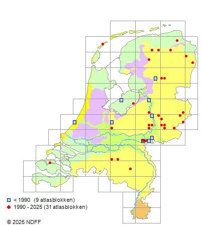 Het aantal atlasblokken (5x5 km) waarin de soort is gemeld binnen een periode van vijf jaar (vanaf 1980) of twintig jaar. Niet gecorrigeerd voor waarnemersinspanning en het aantal doorgegeven waarnemingen kan sterk variëren per periode, dus een trend in verspreiding kan hier niet direct uit worden afgelezen. Het opgegeven jaartal is het eerste jaar van de periode. Bron: gevalideerde waarnemingen uit de NDFF.