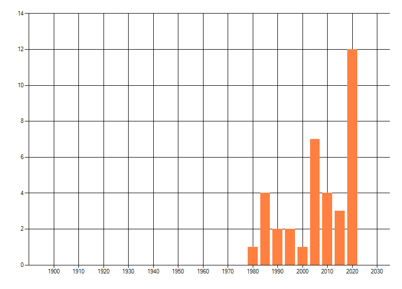Het aantal atlasblokken (5x5 km) waarin de soort is gemeld binnen een periode van vijf jaar (vanaf 1980) of twintig jaar. Niet gecorrigeerd voor waarnemersinspanning en het aantal doorgegeven waarnemingen kan sterk variëren per periode, dus een trend in verspreiding kan hier niet direct uit worden afgelezen. Het opgegeven jaartal is het eerste jaar van de periode. Bron: gevalideerde waarnemingen uit de NDFF.