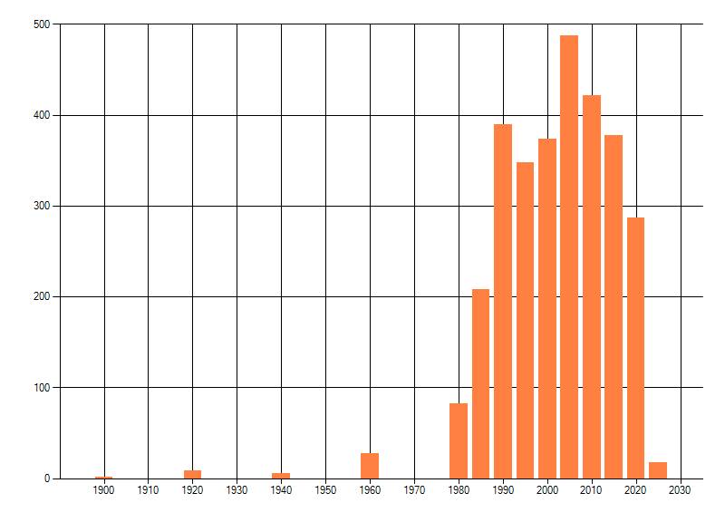 Het aantal atlasblokken (5x5 km) waarin de soort is gemeld binnen een periode van vijf jaar (vanaf 1980) of twintig jaar. Niet gecorrigeerd voor waarnemersinspanning en het aantal doorgegeven waarnemingen kan sterk variƫren per periode, dus een trend in verspreiding kan hier niet direct uit worden afgelezen. Het opgegeven jaartal is het eerste jaar van de periode. Bron: gevalideerde waarnemingen uit de NDFF.