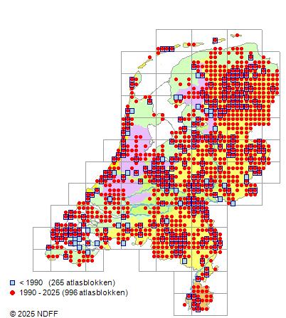 Het aantal atlasblokken (5x5 km) waarin de soort is gemeld binnen een periode van vijf jaar (vanaf 1980) of twintig jaar. Niet gecorrigeerd voor waarnemersinspanning en het aantal doorgegeven waarnemingen kan sterk variëren per periode, dus een trend in verspreiding kan hier niet direct uit worden afgelezen. Het opgegeven jaartal is het eerste jaar van de periode. Bron: gevalideerde waarnemingen uit de NDFF.