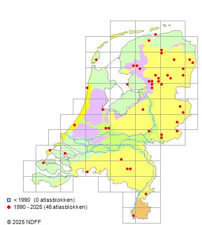 Het aantal atlasblokken (5x5 km) waarin de soort is gemeld binnen een periode van vijf jaar (vanaf 1980) of twintig jaar. Niet gecorrigeerd voor waarnemersinspanning en het aantal doorgegeven waarnemingen kan sterk variëren per periode, dus een trend in verspreiding kan hier niet direct uit worden afgelezen. Het opgegeven jaartal is het eerste jaar van de periode. Bron: gevalideerde waarnemingen uit de NDFF.