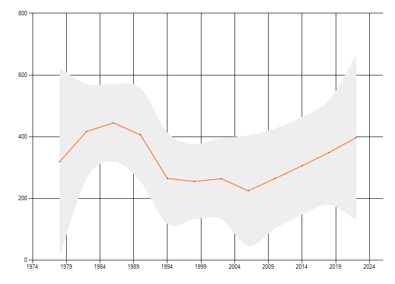 Gemiddelde trend van het aantal kilometerhokken waarin de soort voorkomt, weergegeven als indexcijfer (1975-1978 = 100). De trend is gecorrigeerd voor waarnemersinspanning en geeft de relatieve verandering in het aantal bezette kilometerhokken weer. Voor de berekening worden de data per periode van vier jaar samengenomen. In de grafiek correspondeert ieder punt met het laatste jaar van zo'n periode.