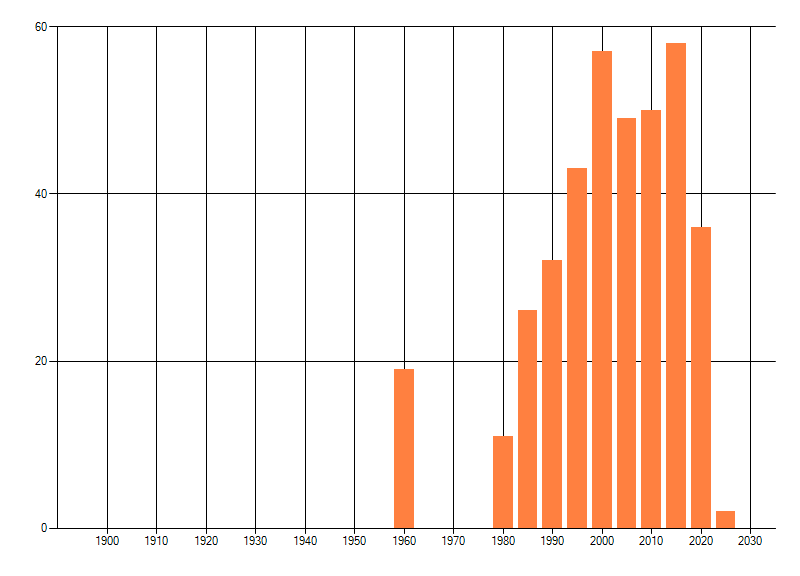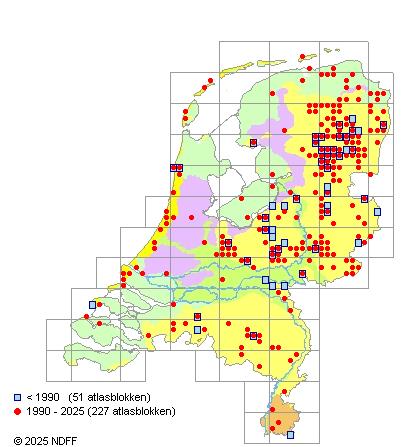 Het aantal atlasblokken (5x5 km) waarin de soort is gemeld binnen een periode van vijf jaar (vanaf 1980) of twintig jaar. Niet gecorrigeerd voor waarnemersinspanning en het aantal doorgegeven waarnemingen kan sterk variëren per periode, dus een trend in verspreiding kan hier niet direct uit worden afgelezen. Het opgegeven jaartal is het eerste jaar van de periode. Bron: gevalideerde waarnemingen uit de NDFF.