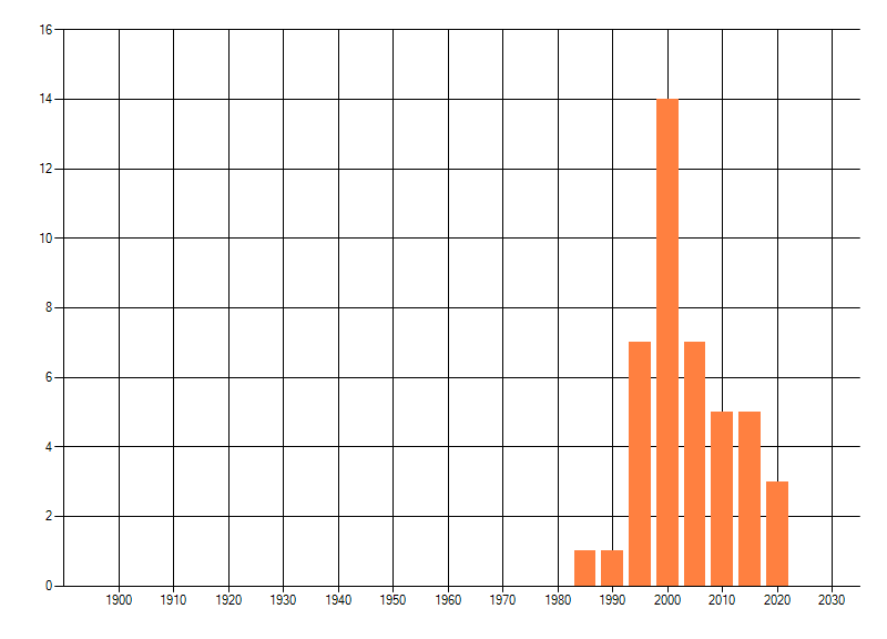 Het aantal atlasblokken (5x5 km) waarin de soort is gemeld binnen een periode van vijf jaar (vanaf 1980) of twintig jaar. Niet gecorrigeerd voor waarnemersinspanning en het aantal doorgegeven waarnemingen kan sterk variëren per periode, dus een trend in verspreiding kan hier niet direct uit worden afgelezen. Het opgegeven jaartal is het eerste jaar van de periode. Bron: gevalideerde waarnemingen uit de NDFF.