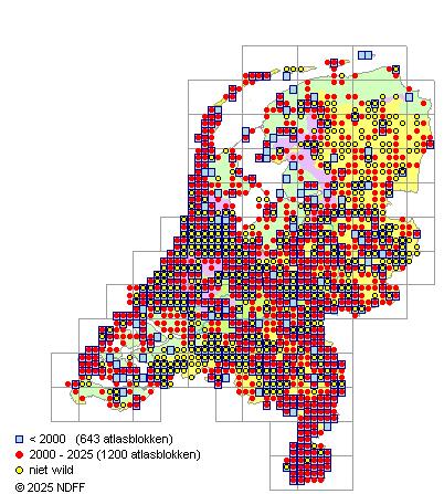 CC BY-NC-SA 3.0 NLVerspreidingNederlandVrij algemeen in de Hollandse en Zeeuwse duinen en plaatselijk in stedelijke gebieden en vrij zeldzaam in Zuid-Limburg en in het rivierengebied. Elders zeldzaam en zeer zeldzaam in het noordoosten.