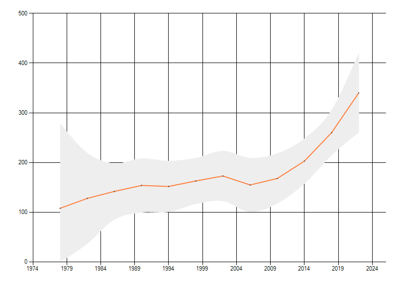 In de grafiek correspondeert ieder punt met het laatste jaar van zo'n periode.