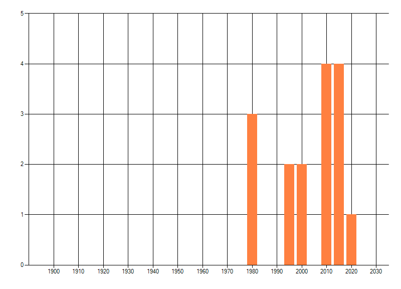 Het aantal atlasblokken (5x5 km) waarin de soort is gemeld binnen een periode van vijf jaar (vanaf 1980) of twintig jaar. Niet gecorrigeerd voor waarnemersinspanning en het aantal doorgegeven waarnemingen kan sterk variëren per periode, dus een trend in verspreiding kan hier niet direct uit worden afgelezen. Het opgegeven jaartal is het eerste jaar van de periode. Bron: gevalideerde waarnemingen uit de NDFF.