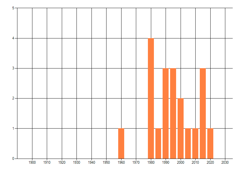 Het aantal atlasblokken (5x5 km) waarin de soort is gemeld binnen een periode van vijf jaar (vanaf 1980) of twintig jaar. Niet gecorrigeerd voor waarnemersinspanning en het aantal doorgegeven waarnemingen kan sterk variëren per periode, dus een trend in verspreiding kan hier niet direct uit worden afgelezen. Het opgegeven jaartal is het eerste jaar van de periode. Bron: gevalideerde waarnemingen uit de NDFF.
