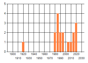 Het aantal atlasblokken (5x5 km) waarin de soort is gemeld binnen een periode van vijf jaar (vanaf 1980) of twintig jaar. Niet gecorrigeerd voor waarnemersinspanning en het aantal doorgegeven waarnemingen kan sterk variëren per periode, dus een trend in verspreiding kan hier niet direct uit worden afgelezen. Het opgegeven jaartal is het eerste jaar van de periode. Bron: gevalideerde waarnemingen uit de NDFF.