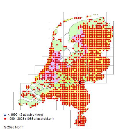 Het aantal atlasblokken (5x5 km) waarin de soort is gemeld binnen een periode van vijf jaar (vanaf 1980) of twintig jaar. Niet gecorrigeerd voor waarnemersinspanning en het aantal doorgegeven waarnemingen kan sterk variëren per periode, dus een trend in verspreiding kan hier niet direct uit worden afgelezen. Het opgegeven jaartal is het eerste jaar van de periode. Bron: gevalideerde waarnemingen uit de NDFF.