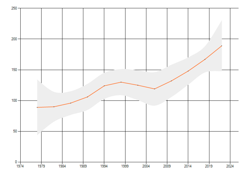 Gemiddelde trend van het aantal kilometerhokken waarin de soort voorkomt, weergegeven als indexcijfer (1975-1978 = 100).