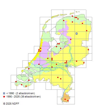 Het aantal atlasblokken (5x5 km) waarin de soort is gemeld binnen een periode van vijf jaar (vanaf 1980) of twintig jaar. Niet gecorrigeerd voor waarnemersinspanning en het aantal doorgegeven waarnemingen kan sterk variëren per periode, dus een trend in verspreiding kan hier niet direct uit worden afgelezen. Het opgegeven jaartal is het eerste jaar van de periode. Bron: gevalideerde waarnemingen uit de NDFF.