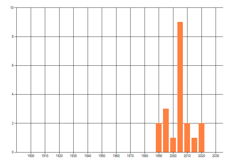 Het aantal atlasblokken (5x5 km) waarin de soort is gemeld binnen een periode van vijf jaar (vanaf 1980) of twintig jaar. Niet gecorrigeerd voor waarnemersinspanning en het aantal doorgegeven waarnemingen kan sterk variëren per periode, dus een trend in verspreiding kan hier niet direct uit worden afgelezen. Het opgegeven jaartal is het eerste jaar van de periode. Bron: gevalideerde waarnemingen uit de NDFF.