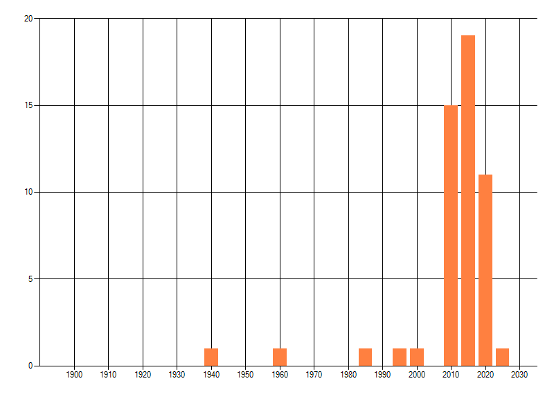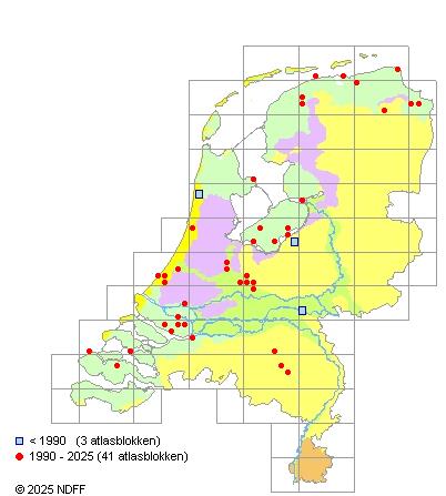 Het aantal atlasblokken (5x5 km) waarin de soort is gemeld binnen een periode van vijf jaar (vanaf 1980) of twintig jaar. Niet gecorrigeerd voor waarnemersinspanning en het aantal doorgegeven waarnemingen kan sterk variëren per periode, dus een trend in verspreiding kan hier niet direct uit worden afgelezen. Het opgegeven jaartal is het eerste jaar van de periode. Bron: gevalideerde waarnemingen uit de NDFF.