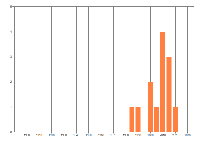 Het aantal atlasblokken (5x5 km) waarin de soort is gemeld binnen een periode van vijf jaar (vanaf 1980) of twintig jaar. Niet gecorrigeerd voor waarnemersinspanning en het aantal doorgegeven waarnemingen kan sterk variëren per periode, dus een trend in verspreiding kan hier niet direct uit worden afgelezen. Het opgegeven jaartal is het eerste jaar van de periode. Bron: gevalideerde waarnemingen uit de NDFF.