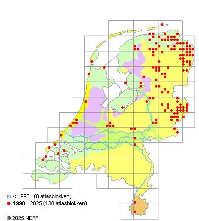 Het aantal atlasblokken (5x5 km) waarin de soort is gemeld binnen een periode van vijf jaar (vanaf 1980) of twintig jaar. Niet gecorrigeerd voor waarnemersinspanning en het aantal doorgegeven waarnemingen kan sterk variëren per periode, dus een trend in verspreiding kan hier niet direct uit worden afgelezen. Het opgegeven jaartal is het eerste jaar van de periode. Bron: gevalideerde waarnemingen uit de NDFF.