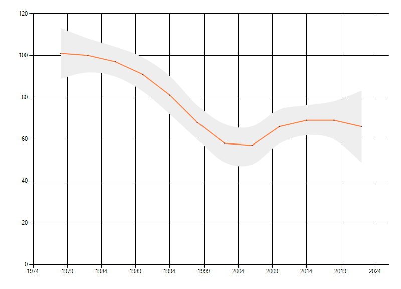 Gemiddelde trend van het aantal kilometerhokken waarin de soort voorkomt, weergegeven als indexcijfer (1975-1978 = 100). De trend is gecorrigeerd voor waarnemersinspanning en geeft de relatieve verandering in het aantal bezette kilometerhokken weer. Voor de berekening worden de data per periode van vier jaar samengenomen. In de grafiek correspondeert ieder punt met het laatste jaar van zo'n periode.