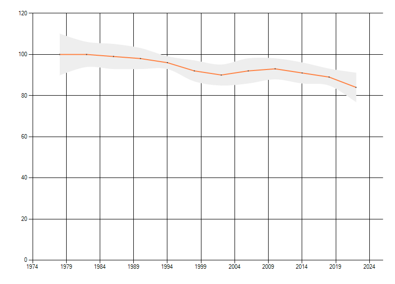 Gemiddelde trend van het aantal kilometerhokken waarin de soort voorkomt, weergegeven als indexcijfer (1975-1978 = 100). De trend is gecorrigeerd voor waarnemersinspanning en geeft de relatieve verandering in het aantal bezette kilometerhokken weer. Voor de berekening worden de data per periode van vier jaar samengenomen. In de grafiek correspondeert ieder punt met het laatste jaar van zo'n periode.