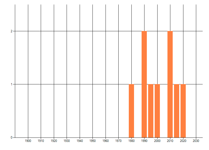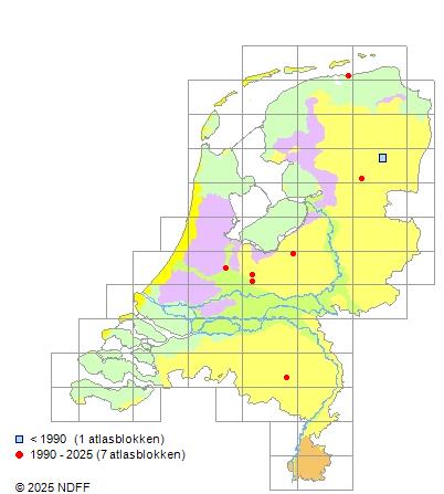 Het aantal atlasblokken (5x5 km) waarin de soort is gemeld binnen een periode van vijf jaar (vanaf 1980) of twintig jaar. Niet gecorrigeerd voor waarnemersinspanning en het aantal doorgegeven waarnemingen kan sterk variëren per periode, dus een trend in verspreiding kan hier niet direct uit worden afgelezen. Het opgegeven jaartal is het eerste jaar van de periode. Bron: gevalideerde waarnemingen uit de NDFF.