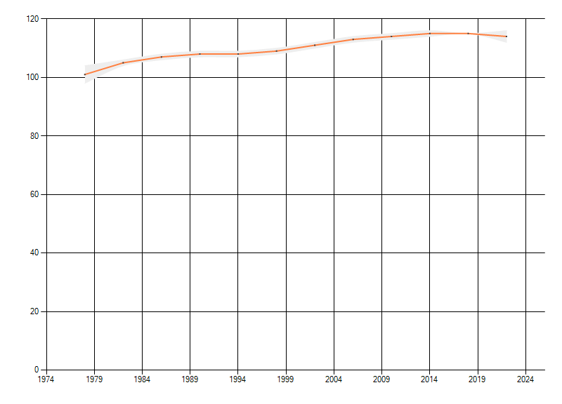 Gemiddelde trend van het aantal kilometerhokken waarin de soort voorkomt, weergegeven als indexcijfer (1975-1978 = 100).