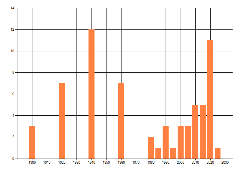 Het aantal atlasblokken (5x5 km) waarin de soort is gemeld binnen een periode van vijf jaar (vanaf 1980) of twintig jaar. Niet gecorrigeerd voor waarnemersinspanning en het aantal doorgegeven waarnemingen kan sterk variëren per periode, dus een trend in verspreiding kan hier niet direct uit worden afgelezen. Het opgegeven jaartal is het eerste jaar van de periode. Bron: gevalideerde waarnemingen uit de NDFF.