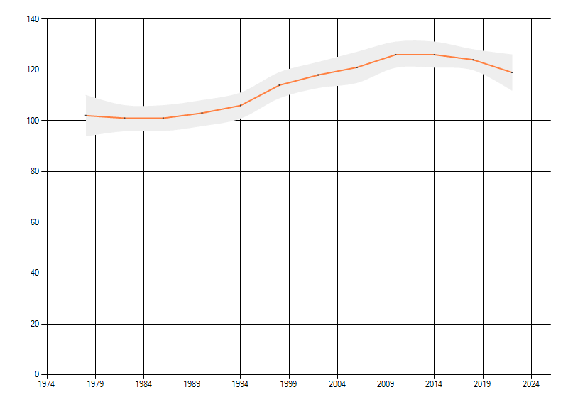 Gemiddelde trend van het aantal kilometerhokken waarin de soort voorkomt, weergegeven als indexcijfer (1975-1978 = 100).