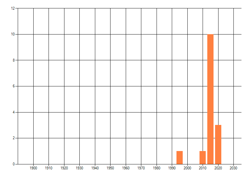 Het aantal atlasblokken (5x5 km) waarin de soort is gemeld binnen een periode van vijf jaar (vanaf 1980) of twintig jaar. Niet gecorrigeerd voor waarnemersinspanning en het aantal doorgegeven waarnemingen kan sterk variëren per periode, dus een trend in verspreiding kan hier niet direct uit worden afgelezen. Het opgegeven jaartal is het eerste jaar van de periode. Bron: gevalideerde waarnemingen uit de NDFF.