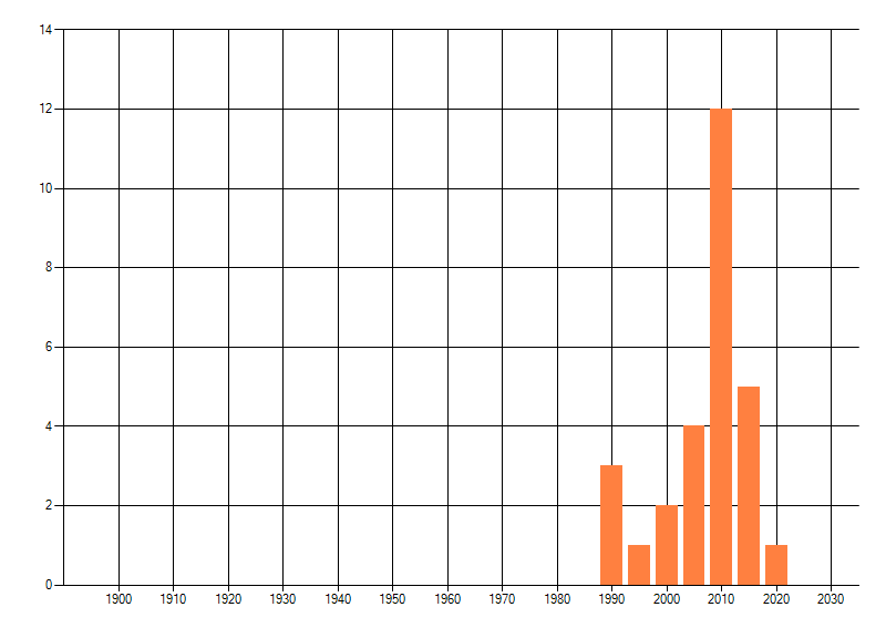 Het aantal atlasblokken (5x5 km) waarin de soort is gemeld binnen een periode van vijf jaar (vanaf 1980) of twintig jaar. Niet gecorrigeerd voor waarnemersinspanning en het aantal doorgegeven waarnemingen kan sterk variëren per periode, dus een trend in verspreiding kan hier niet direct uit worden afgelezen. Het opgegeven jaartal is het eerste jaar van de periode. Bron: gevalideerde waarnemingen uit de NDFF.