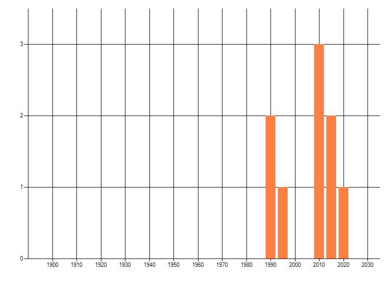 Het aantal atlasblokken (5x5 km) waarin de soort is gemeld binnen een periode van vijf jaar (vanaf 1980) of twintig jaar. Niet gecorrigeerd voor waarnemersinspanning en het aantal doorgegeven waarnemingen kan sterk variëren per periode, dus een trend in verspreiding kan hier niet direct uit worden afgelezen. Het opgegeven jaartal is het eerste jaar van de periode. Bron: gevalideerde waarnemingen uit de NDFF.