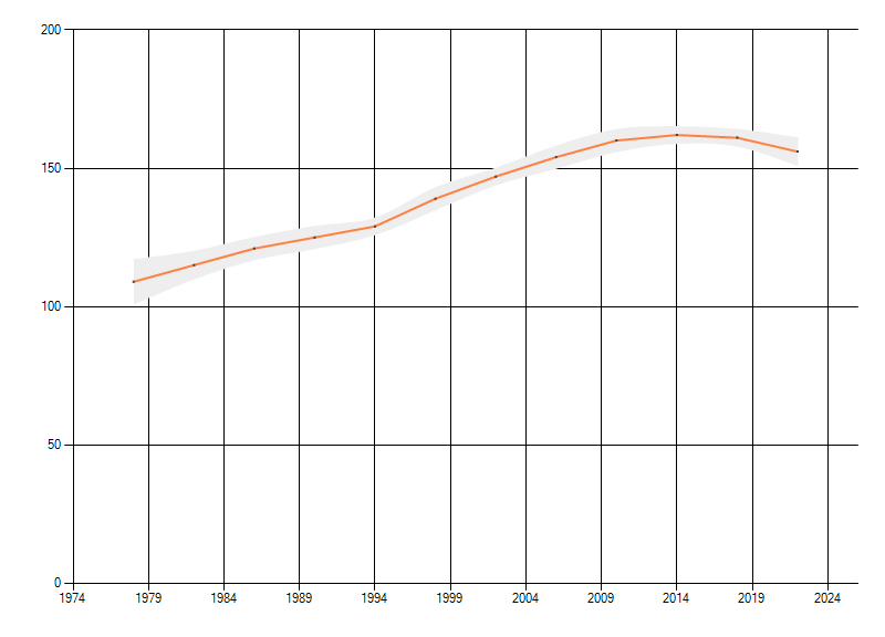 Gemiddelde trend van het aantal kilometerhokken waarin de soort voorkomt, weergegeven als indexcijfer (1975-1978 = 100).