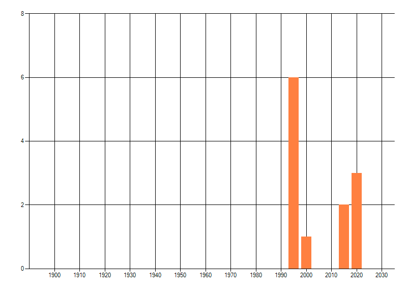 Het aantal atlasblokken (5x5 km) waarin de soort is gemeld binnen een periode van vijf jaar (vanaf 1980) of twintig jaar. Niet gecorrigeerd voor waarnemersinspanning en het aantal doorgegeven waarnemingen kan sterk variëren per periode, dus een trend in verspreiding kan hier niet direct uit worden afgelezen. Het opgegeven jaartal is het eerste jaar van de periode. Bron: gevalideerde waarnemingen uit de NDFF.