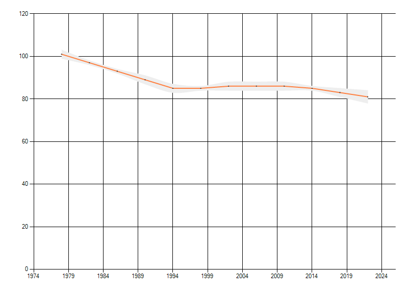 Gemiddelde trend van het aantal kilometerhokken waarin de soort voorkomt, weergegeven als indexcijfer (1975-1978 = 100).