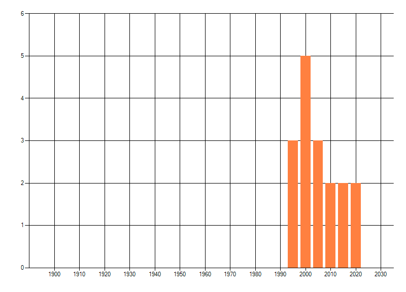Het aantal atlasblokken (5x5 km) waarin de soort is gemeld binnen een periode van vijf jaar (vanaf 1980) of twintig jaar. Niet gecorrigeerd voor waarnemersinspanning en het aantal doorgegeven waarnemingen kan sterk variëren per periode, dus een trend in verspreiding kan hier niet direct uit worden afgelezen. Het opgegeven jaartal is het eerste jaar van de periode. Bron: gevalideerde waarnemingen uit de NDFF.