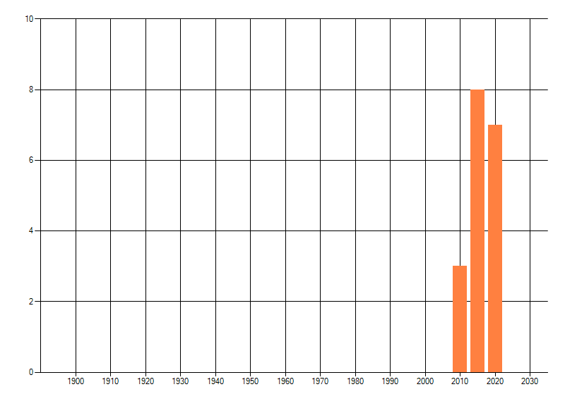 Het aantal atlasblokken (5x5 km) waarin de soort is gemeld binnen een periode van vijf jaar (vanaf 1980) of twintig jaar. Niet gecorrigeerd voor waarnemersinspanning en het aantal doorgegeven waarnemingen kan sterk variëren per periode, dus een trend in verspreiding kan hier niet direct uit worden afgelezen. Het opgegeven jaartal is het eerste jaar van de periode. Bron: gevalideerde waarnemingen uit de NDFF.