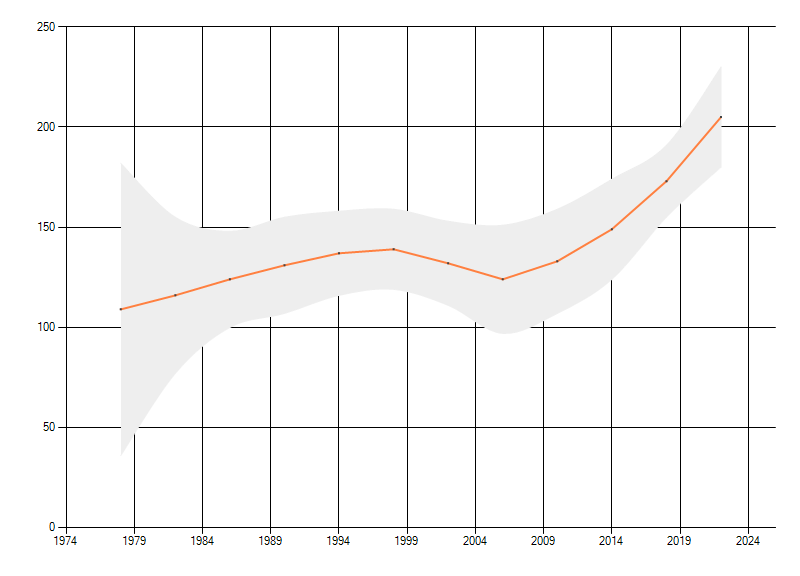Gemiddelde trend van het aantal kilometerhokken waarin de soort voorkomt, weergegeven als indexcijfer (1975-1978 = 100).