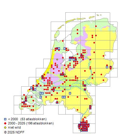 CC BY-NC-SA 3.0 NLVerspreidingNederlandVrij zeldzaam in Zuid-Limburg en zeldzaam in Flevoland. Elders zeer zeldzaam (o.a. in Twente en bij Nijmegen) of ontbrekend.
