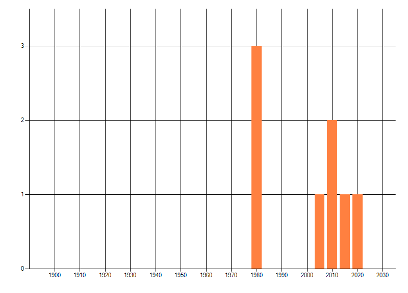 Het aantal atlasblokken (5x5 km) waarin de soort is gemeld binnen een periode van vijf jaar (vanaf 1980) of twintig jaar. Niet gecorrigeerd voor waarnemersinspanning en het aantal doorgegeven waarnemingen kan sterk variëren per periode, dus een trend in verspreiding kan hier niet direct uit worden afgelezen. Het opgegeven jaartal is het eerste jaar van de periode. Bron: gevalideerde waarnemingen uit de NDFF.