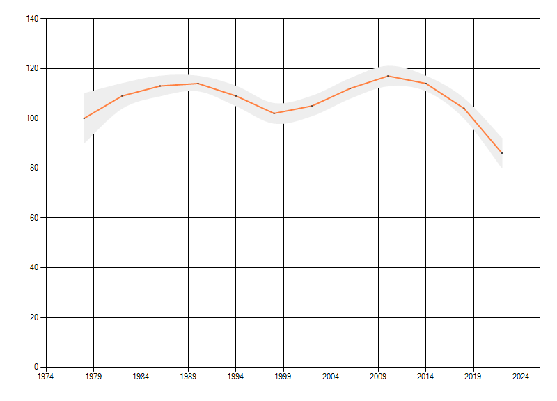 Gemiddelde trend van het aantal kilometerhokken waarin de soort voorkomt, weergegeven als indexcijfer (1975-1978 = 100).